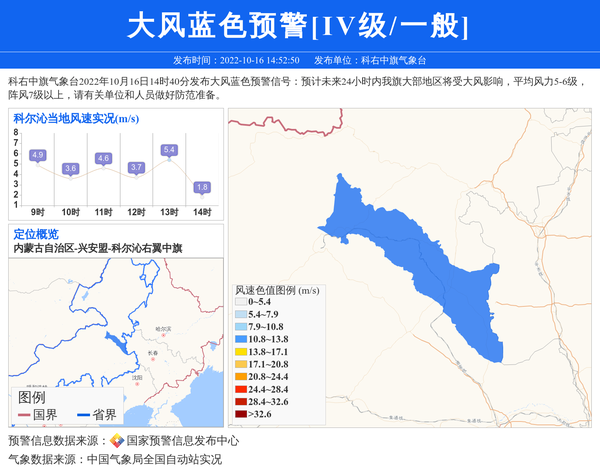 科右中旗气象台2022年10月16日14时40分发布大风蓝色预警信号:预计未来24小时内我旗大部地区将受大风影响,平均风力5-6级,阵风7级以上,请有关单位和人员做好防范准备。 信息来源:国家预警信息发布中心; 发布单位:科右中旗气象台。