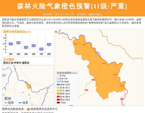 嘉荫县气象台和森林防灭火指挥部办公室10月15日09时10分联合发布嘉荫县森林火险气象橙色预警信号:预计未来24小时内,嘉荫境内风力大,气温高,森林火险等级高,请有关单位和人员立即按照相应级别的“预警响应机制”进入森林防火工作状态,做好各项防范和扑火准备。 信息来源:国家预警信息发布中心; 发布单位:嘉荫县气象台。