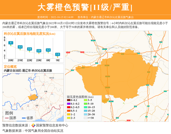 内蒙古通辽市科尔沁左翼后旗气象台2022年10月15日02时12分发布大雾橙色预警信号:6小时内科尔沁左翼后旗可能出现能见度小于200米的雾,或者已经出现能见度小于200米、大于等于50米的雾并将持续。请有关单位和人员做好防范准备。 信息来源:国家预警信息发布中心; 发布单位:内蒙古通辽市科尔沁左翼后旗气象台。