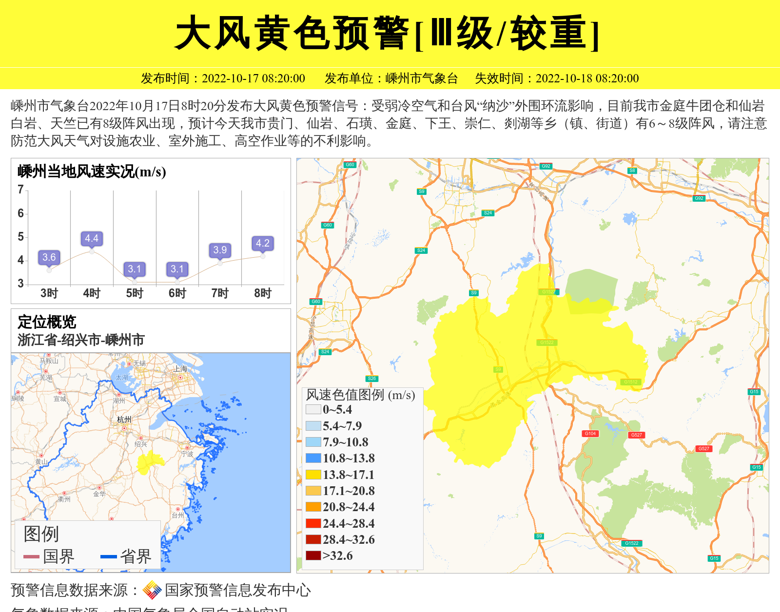 嵊州市气象台2022年10月17日8时20分发布大风黄色预警信号:受弱冷空气和台风“纳沙”外围环流影响,目前我市金庭牛团仓和仙岩白岩、天竺已有8级阵风出现,预计今天我市贵门、仙岩、石璜、金庭、下王、崇仁、剡湖等乡(镇、街道)有6~8级阵风,请注意防范大风天气对设施农业、室外施工、高空作业等的不利影响。 信息来源:国家预警信息发布中心; 发布单位:嵊州市气象台。