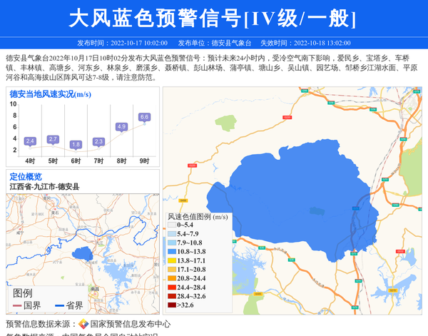 德安县气象台2022年10月17日10时02分发布大风蓝色预警信号:预计未来24小时内,受冷空气南下影响,爱民乡、宝塔乡、车桥镇、丰林镇、高塘乡、河东乡、林泉乡、磨溪乡、聂桥镇、彭山林场、蒲亭镇、塘山乡、吴山镇、园艺场、邹桥乡江湖水面、平原河谷和高海拔山区阵风可达7-8级,请注意防范。 信息来源:国家预警信息发布中心; 发布单位:德安县气象台。