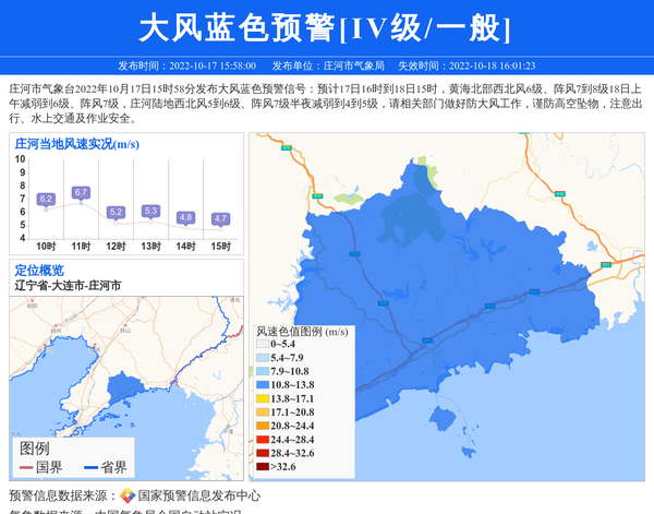 庄河市气象台2022年10月17日15时58分发布大风蓝色预警信号:预计17日16时到18日15时,黄海北部西北风6级、阵风7到8级18日上午减弱到6级、阵风7级,庄河陆地西北风5到6级、阵风7级半夜减弱到4到5级,请相关部门做好防大风工作,谨防高空坠物,注意出行、水上交通及作业安全。 信息来源:国家预警信息发布中心; 发布单位:庄河市气象局。