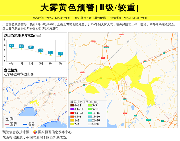 大雾黄色预警信号:预计15日6时到9时,盘山县将出现能见度小于500米的大雾天气,请做好防雾工作,交通、户外活动注意安全。盘山县气象台2022年10月15日5时57分发布 信息来源:国家预警信息发布中心; 发布单位:盘山县气象局。