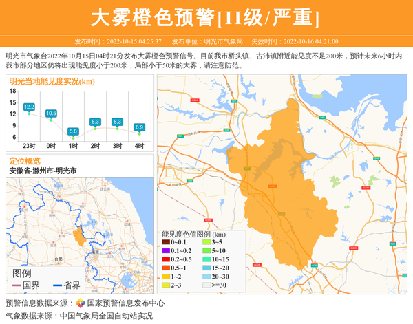 明光市气象台2022年10月15日04时21分发布大雾橙色预警信号。目前我市桥头镇、古沛镇附近能见度不足200米,预计未来6小时内我市部分地区仍将出现能见度小于200米,局部小于50米的大雾,请注意防范。 信息来源:国家预警信息发布中心; 发布单位:明光市气象局。