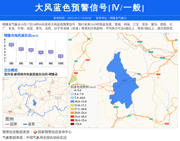 晴隆县气象台10月17日10时08分发布大风蓝色预警信号:预计未来24小时我县东观、莲城、鸡场、三宝、安谷、紫马、碧痕、大厂、长流、中营、花贡、茶马、光照、沙子等乡镇(街道)将受到大风影响,平均风力可达6级以上,阵风7级以上,请注意防范。 信息来源:国家预警信息发布中心; 发布单位:晴隆县气象台。