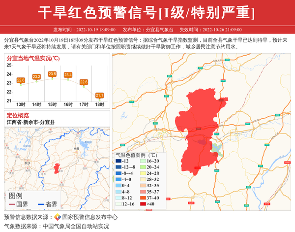 分宜县气象台2022年10月19日18时09分发布干旱红色预警信号:据综合气象干旱指数监测,目前全县气象干旱已达到特旱,预计未来7天气象干旱还将持续发展,请有关部门和单位按照职责继续做好干旱防御工作,城乡居民注意节约用水。 信息来源:国家预警信息发布中心; 发布单位:分宜县气象台。