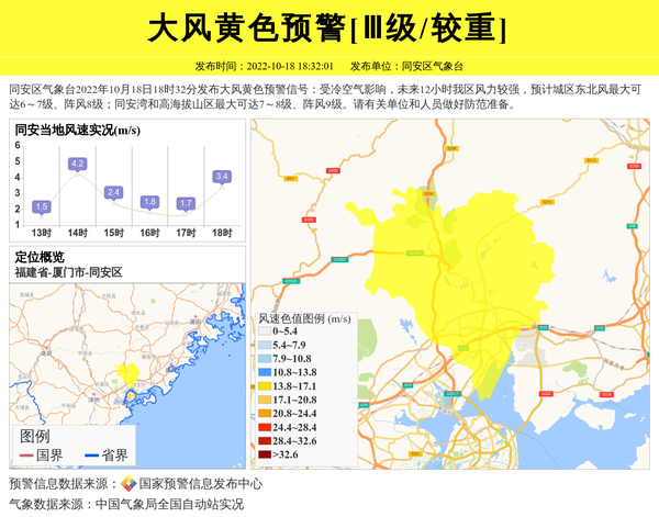 同安区气象台2022年10月18日18时32分发布大风黄色预警信号:受冷空气影响,未来12小时我区风力较强,预计城区东北风最大可达6~7级、阵风8级;同安湾和高海拔山区最大可达7~8级、阵风9级。请有关单位和人员做好防范准备。 信息来源:国家预警信息发布中心; 发布单位:同安区气象台。