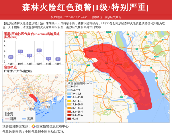 【南沙区森林火险红色预警】预计未来几日天气持续干燥,森林火险等级高,15时43分起南沙区森林火险黄色预警信号升级为红色。天干物燥,请注意森林防火及家居用火安全。南沙区气象台10月20日发布 信息来源:国家预警信息发布中心; 发布单位:南沙区气象台。
