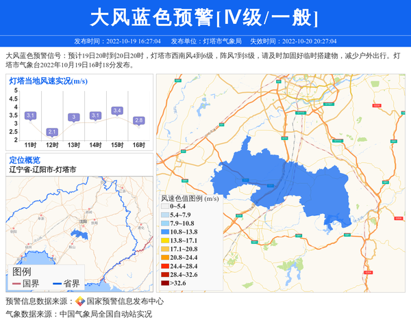 大风蓝色预警信号:预计19日20时到20日20时,灯塔市西南风4到6级,阵风7到8级,请及时加固好临时搭建物,减少户外出行。灯塔市气象台2022年10月19日16时18分发布。 信息来源:国家预警信息发布中心; 发布单位:灯塔市气象局。
