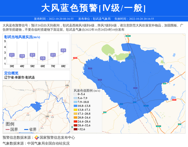 大风蓝色预警信号:预计20日白天到夜间,彰武县西南风5级到6级,阵风7级到8级,请注意防范大风吹落室外物品,加固围板、广告牌等搭建物,不要在临时搭建物下面逗留。彰武县气象台2022年10月20日8时10分发布 信息来源:国家预警信息发布中心; 发布单位:彰武县气象局。