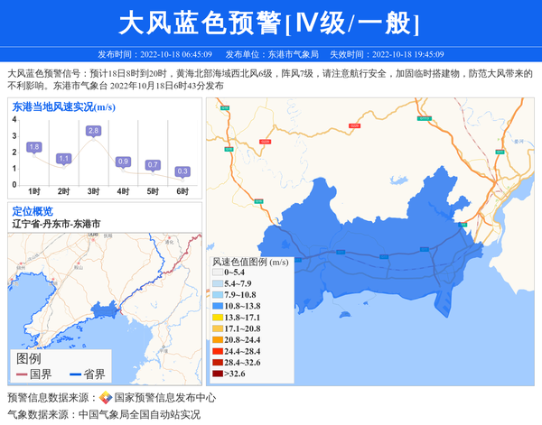 大风蓝色预警信号:预计18日8时到20时,黄海北部海域西北风6级,阵风7级,请注意航行安全,加固临时搭建物,防范大风带来的不利影响。东港市气象台 2022年10月18日6时43分发布 信息来源:国家预警信息发布中心; 发布单位:东港市气象局。
