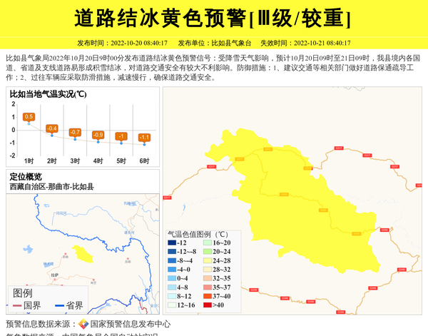 比如县气象局2022年10月20日9时00分发布道路结冰黄色预警信号:受降雪天气影响,预计10月20日09时至21日09时,我县境内各国道、省道及支线道路易形成积雪结冰,对道路交通安全有较大不利影响。防御措施:1、建议交通等相关部门做好道路保通疏导工作;2、过往车辆应采取防滑措施,减速慢行,确保道路交通安全。 信息来源:国家预警信息发布中心; 发布单位:比如县气象台。