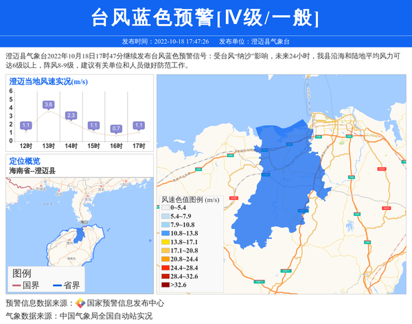 澄迈县气象台2022年10月18日17时47分继续发布台风蓝色预警信号:受台风“纳沙”影响,未来24小时,我县沿海和陆地平均风力可达6级以上,阵风8-9级,建议有关单位和人员做好防范工作。 信息来源:国家预警信息发布中心; 发布单位:澄迈县气象台。