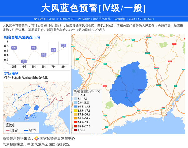 大风蓝色预警信号:预计20日8时到21日8时,岫岩县偏南风4到6级,阵风7到8级,请相关部门做好防大风工作,关好门窗,加固搭建物,注意森林、草原等防火。岫岩县气象台2022年10月20日8时36分发布 信息来源:国家预警信息发布中心; 发布单位:岫岩县气象局。