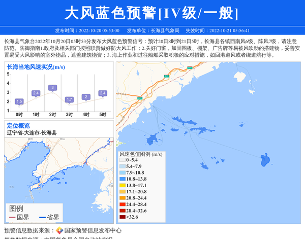 长海县气象台2022年10月20日05时53分发布大风蓝色预警信号:预计20日8时到21日5时,长海县各镇西南风6级、阵风7级,请注意防范。防御指南1.政府及相关部门按照职责做好防大风工作;2.关好门窗,加固围板、棚架、广告牌等易被风吹动的搭建物,妥善安置易受大风影响的室外物品,遮盖建筑物资;3. 海上作业和过往船舶采取积极的应对措施,如回港避风或者绕道航行等。 信息来源:国家预警信息发布中心; 发布单位:长海县气象局。