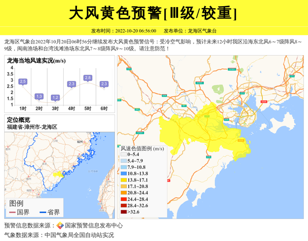 龙海区气象台2022年10月20日06时56分继续发布大风黄色预警信号:受冷空气影响,预计未来12小时我区沿海东北风6~7级阵风8~9级,闽南渔场和台湾浅滩渔场东北风7~8级阵风9~10级。请注意防范! 信息来源:国家预警信息发布中心; 发布单位:龙海区气象台。