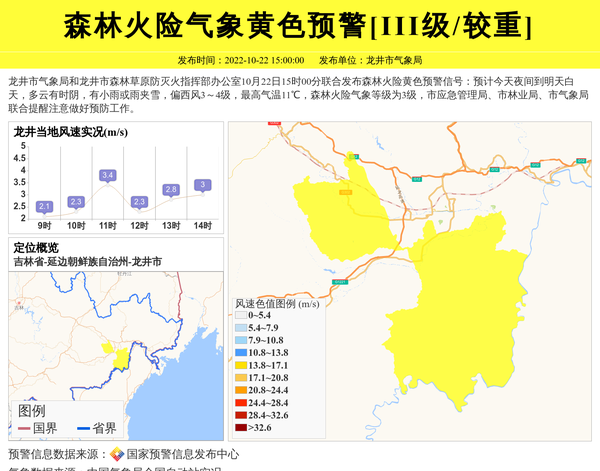 龙井市气象局和龙井市森林草原防灭火指挥部办公室10月22日15时00分联合发布森林火险黄色预警信号:预计今天夜间到明天白天,多云有时阴,有小雨或雨夹雪,偏西风3~4级,最高气温11℃,森林火险气象等级为3级,市应急管理局、市林业局、市气象局联合提醒注意做好预防工作。 信息来源:国家预警信息发布中心; 发布单位:龙井市气象局。