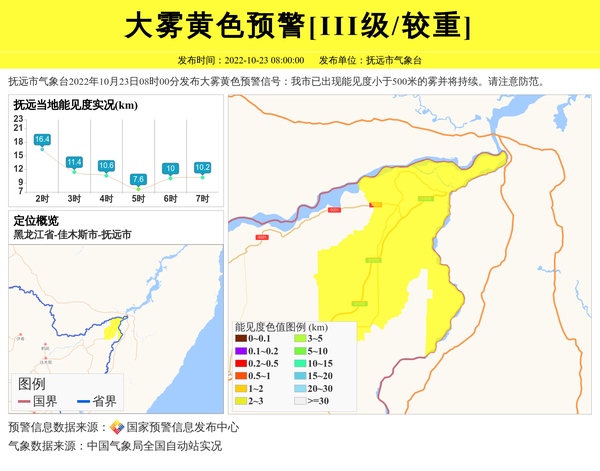 抚远市气象台2022年10月23日08时00分发布大雾黄色预警信号:我市已出现能见度小于500米的雾并将持续。请注意防范。 信息来源:国家预警信息发布中心; 发布单位:抚远市气象台。