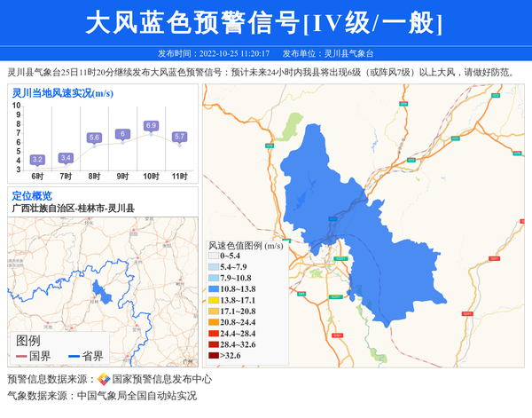 灵川县气象台25日11时20分继续发布大风蓝色预警信号:预计未来24小时内我县将出现6级(或阵风7级)以上大风,请做好防范。 信息来源:国家预警信息发布中心; 发布单位:灵川县气象台。