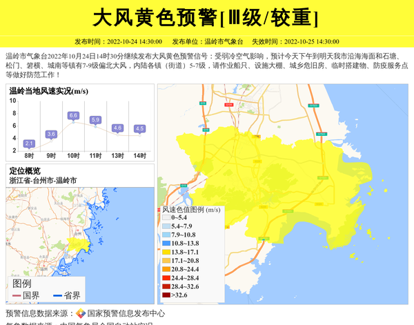 温岭市气象台2022年10月24日14时30分继续发布大风黄色预警信号:受弱冷空气影响,预计今天下午到明天我市沿海海面和石塘、松门、箬横、城南等镇有7-9级偏北大风,内陆各镇(街道)5-7级,请作业船只、设施大棚、城乡危旧房、临时搭建物、防疫服务点等做好防范工作! 信息来源:国家预警信息发布中心; 发布单位:温岭市气象台。