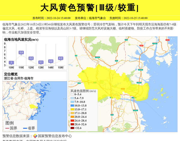 临海市气象台2022年10月24日15时40分继续发布大风黄色预警信号:受弱冷空气影响,预计今天下午到明天我市沿海海面仍有7-9级偏北大风,杜桥、上盘、桃渚等沿海镇以及高山区5-7级。请继续防范大风对设施大棚、临时搭建物、防疫工作点等带来的不利影响,作业船只加强安全管理。 信息来源:国家预警信息发布中心; 发布单位:临海市气象台。