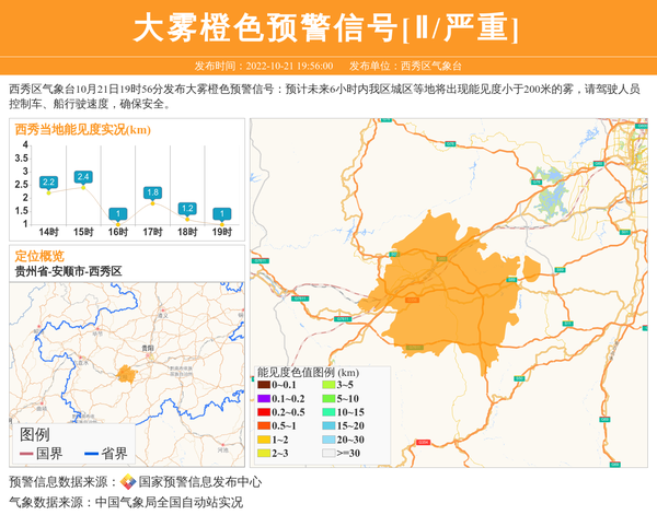 西秀区气象台10月21日19时56分发布大雾橙色预警信号:预计未来6小时内我区城区等地将出现能见度小于200米的雾,请驾驶人员控制车、船行驶速度,确保安全。 信息来源:国家预警信息发布中心; 发布单位:西秀区气象台。