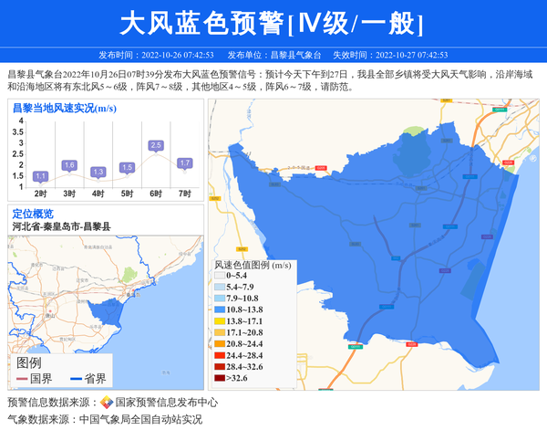 昌黎县气象台2022年10月26日07时39分发布大风蓝色预警信号:预计今天下午到27日,我县全部乡镇将受大风天气影响,沿岸海域和沿海地区将有东北风5~6级,阵风7~8级,其他地区4~5级,阵风6~7级,请防范。 信息来源:国家预警信息发布中心; 发布单位:昌黎县气象台。