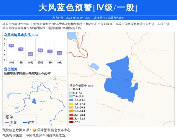 乌苏市气象台2022年10月22日19时17分发布大风蓝色预警信号:预计23日白天到夜间,乌苏市偏西偏北乡镇古尔图镇、车排子镇、马吉克牧场等地有7-8级偏西阵风,需提前做好各项防范工作。 信息来源:国家预警信息发布中心; 发布单位:乌苏市气象台。