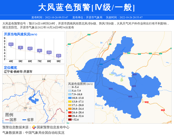 大风蓝色预警信号:预计26日10时到20时,开原市西南风转西北风5到6级、阵风7到8级,大风天气对户外作业和出行有不利影响,请注意防范。开原市气象台2022年10月26日9时54分发布 信息来源:国家预警信息发布中心; 发布单位:开原市气象局。