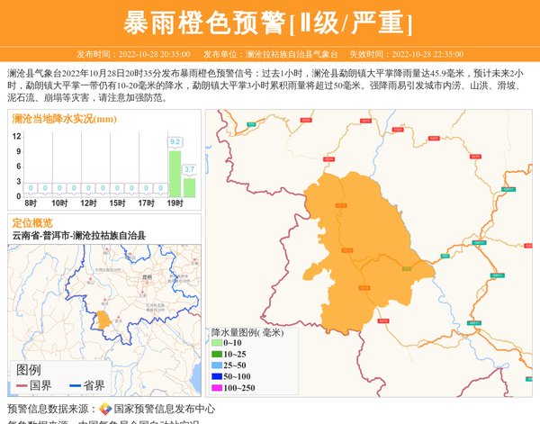 澜沧县气象台2022年10月28日20时35分发布暴雨橙色预警信号:过去1小时,澜沧县勐朗镇大平掌降雨量达45.9毫米,预计未来2小时,勐朗镇大平掌一带仍有10-20毫米的降水,勐朗镇大平掌3小时累积雨量将超过50毫米。强降雨易引发城市内涝、山洪、滑坡、泥石流、崩塌等灾害,请注意加强防范。 信息来源:国家预警信息发布中心; 发布单位:澜沧拉祜族自治县气象台。