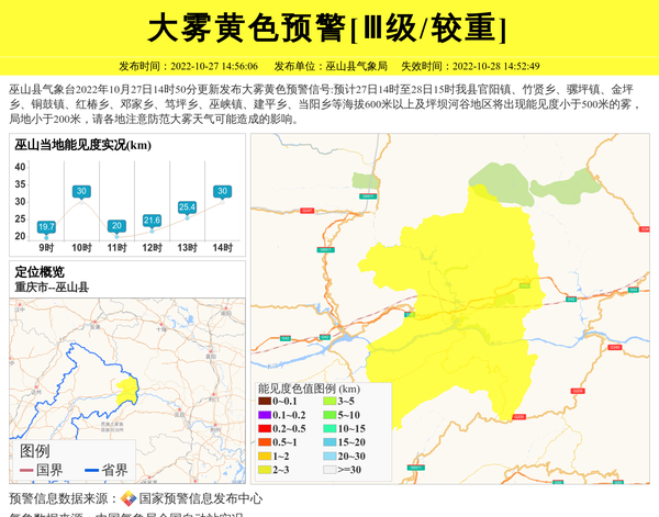 巫山县气象台2022年10月27日14时50分更新发布大雾黄色预警信号:预计27日14时至28日15时我县官阳镇、竹贤乡、骡坪镇、金坪乡、铜鼓镇、红椿乡、邓家乡、笃坪乡、巫峡镇、建平乡、当阳乡等海拔600米以上及坪坝河谷地区将出现能见度小于500米的雾,局地小于200米,请各地注意防范大雾天气可能造成的影响。 信息来源:国家预警信息发布中心; 发布单位:巫山县气象局。