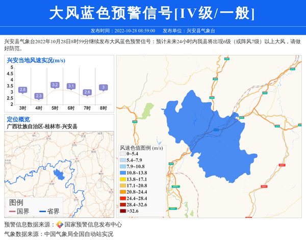 兴安县气象台2022年10月28日8时59分继续发布大风蓝色预警信号:预计未来24小时内我县将出现6级(或阵风7级)以上大风,请做好防范。 信息来源:国家预警信息发布中心; 发布单位:兴安县气象台。