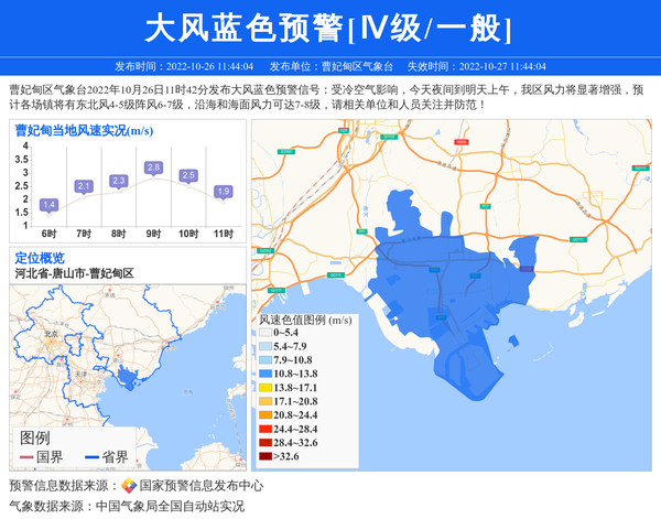 曹妃甸区气象台2022年10月26日11时42分发布大风蓝色预警信号:受冷空气影响,今天夜间到明天上午,我区风力将显著增强,预计各场镇将有东北风4-5级阵风6-7级,沿海和海面风力可达7-8级,请相关单位和人员关注并防范! 信息来源:国家预警信息发布中心; 发布单位:曹妃甸区气象台。