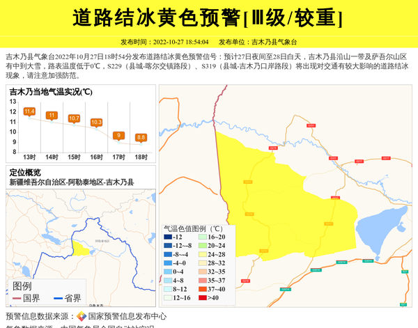 吉木乃县气象台2022年10月27日18时54分发布道路结冰黄色预警信号:预计27日夜间至28日白天,吉木乃县沿山一带及萨吾尔山区有中到大雪,路表温度低于0℃,S229(县城-喀尔交镇路段)、S319(县城-吉木乃口岸路段)将出现对交通有较大影响的道路结冰现象,请注意加强防范。 信息来源:国家预警信息发布中心; 发布单位:吉木乃县气象台。