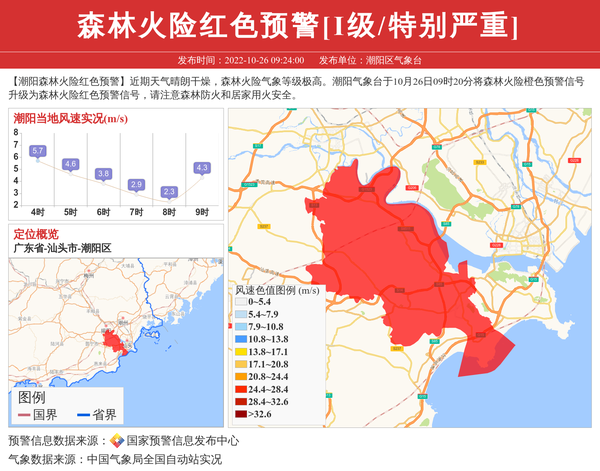 【潮阳森林火险红色预警】近期天气晴朗干燥,森林火险气象等级极高。潮阳气象台于10月26日09时20分将森林火险橙色预警信号升级为森林火险红色预警信号,请注意森林防火和居家用火安全。 信息来源:国家预警信息发布中心; 发布单位:潮阳区气象台。