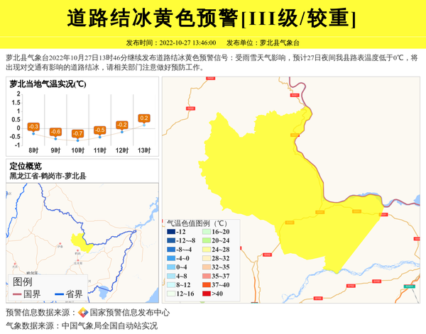 萝北县气象台2022年10月27日13时46分继续发布道路结冰黄色预警信号:受雨雪天气影响,预计27日夜间我县路表温度低于0℃,将出现对交通有影响的道路结冰,请相关部门注意做好预防工作。 信息来源:国家预警信息发布中心; 发布单位:萝北县气象台。