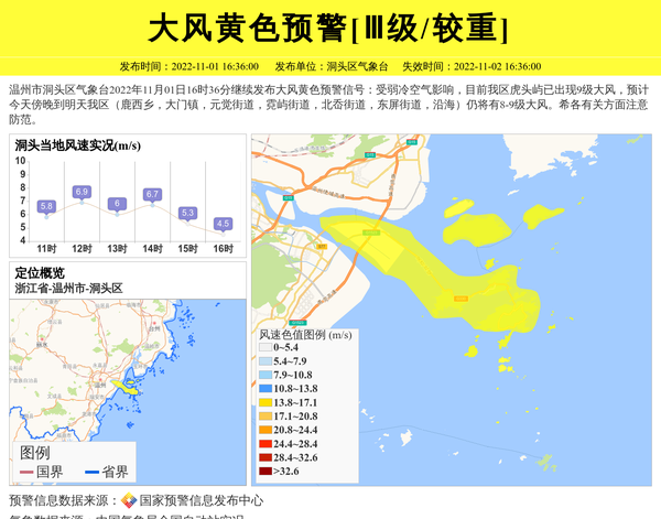 温州市洞头区气象台2022年11月01日16时36分继续发布大风黄色预警信号:受弱冷空气影响,目前我区虎头屿已出现9级大风,预计今天傍晚到明天我区(鹿西乡,大门镇,元觉街道,霓屿街道,北岙街道,东屏街道,沿海)仍将有8-9级大风。希各有关方面注意防范。 信息来源:国家预警信息发布中心; 发布单位:洞头区气象台。