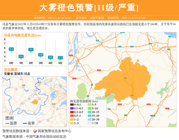 泾县气象台2022年11月02日05时57分发布大雾橙色预警信号。目前我县境内芜黄高速部分路段已出现能见度小于200米、大于等于50米的雾并将持续。请注意交通安全。 信息来源:国家预警信息发布中心; 发布单位:泾县气象局。
