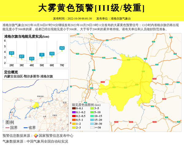 准格尔旗气象台2022年10月30日07时58分继续发布2022年10月29日19时11分发布的大雾黄色预警信号:12小时内准格尔旗仍将出现能见度小于500米的雾,或者已经出现能见度小于500米、大于等于200米的雾并将持续。请有关单位和人员做好防范准备。 信息来源:国家预警信息发布中心; 发布单位:准格尔旗气象台。