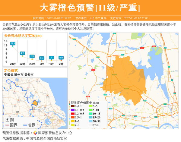 天长市气象台2022年11月01日02时32分发布大雾橙色预警信号。目前我市张铺镇、冶山镇、秦栏镇等部分路段已经出现能见度小于200米的雾,局部能见度可能小于50米。请有关单位和个人注意防范! 信息来源:国家预警信息发布中心; 发布单位:天长市气象局。