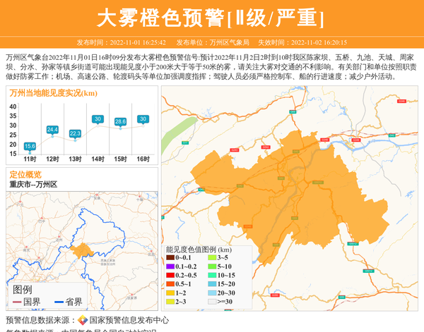 万州区气象台2022年11月01日16时09分发布大雾橙色预警信号:预计2022年11月2日2时到10时我区陈家坝、五桥、九池、天城、周家坝、分水、孙家等镇乡街道可能出现能见度小于200米大于等于50米的雾,请关注大雾对交通的不利影响。有关部门和单位按照职责做好防雾工作;机场、高速公路、轮渡码头等单位加强调度指挥;驾驶人员必须严格控制车、船的行进速度;减少户外活动。 信息来源:国家预警信息发布中心; 发布单位:万州区气象局。