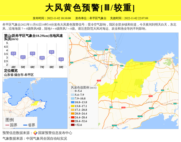 牟平区气象台2022年11月02日10时10分发布大风黄色预警信号:受冷空气影响,我区全部乡镇和街道,今天夜间到明天白天,东北风,沿海海面 7~8级阵风9级,陆地5~6级阵风7~8级。请注意防范大风对海运、农业和渔业等的不利影响。 信息来源:国家预警信息发布中心; 发布单位:牟平区气象台。