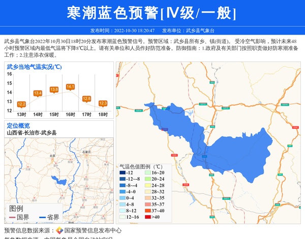 武乡县气象台2022年10月30日18时20分发布寒潮蓝色预警信号。预警区域:武乡县所有乡、镇(街道)。 受冷空气影响,预计未来48小时预警区域内最低气温将下降8℃以上。请有关单位和人员作好防范准备。防御指南:1.政府及有关部门按照职责做好防寒潮准备工作;2.注意添衣保暖。 信息来源:国家预警信息发布中心; 发布单位:武乡县气象台。