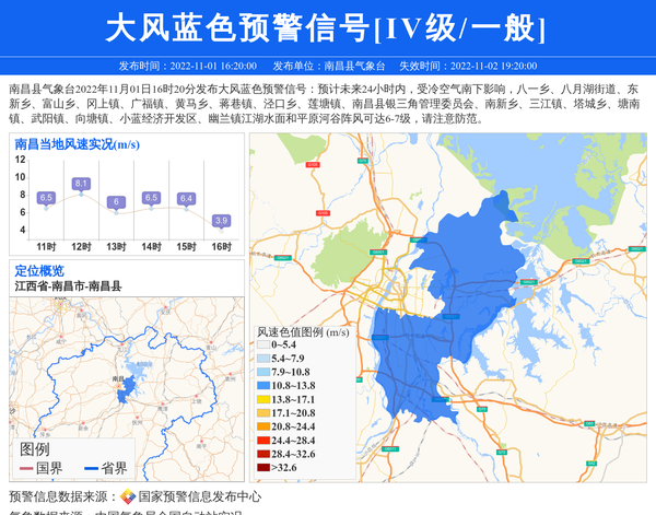 南昌县气象台2022年11月01日16时20分发布大风蓝色预警信号:预计未来24小时内,受冷空气南下影响,八一乡、八月湖街道、东新乡、富山乡、冈上镇、广福镇、黄马乡、蒋巷镇、泾口乡、莲塘镇、南昌县银三角管理委员会、南新乡、三江镇、塔城乡、塘南镇、武阳镇、向塘镇、小蓝经济开发区、幽兰镇江湖水面和平原河谷阵风可达6-7级,请注意防范。 信息来源:国家预警信息发布中心; 发布单位:南昌县气象台。