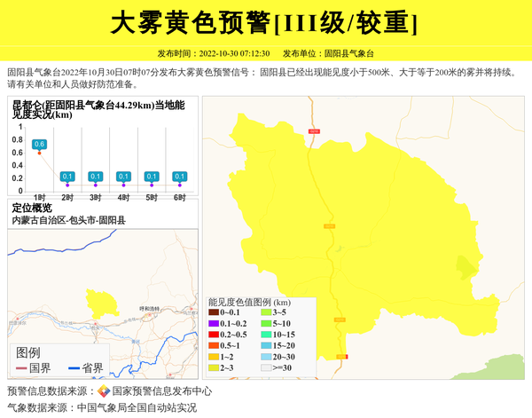 固阳县气象台2022年10月30日07时07分发布大雾黄色预警信号: 固阳县已经出现能见度小于500米、大于等于200米的雾并将持续。请有关单位和人员做好防范准备。 信息来源:国家预警信息发布中心; 发布单位:固阳县气象台。
