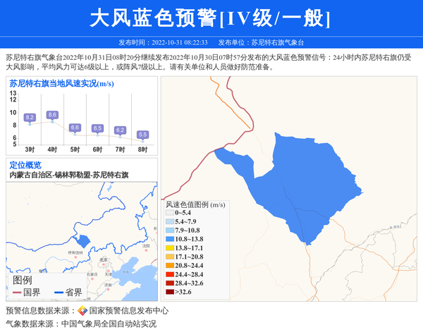 苏尼特右旗气象台2022年10月31日08时20分继续发布2022年10月30日07时57分发布的大风蓝色预警信号:24小时内苏尼特右旗仍受大风影响,平均风力可达6级以上,或阵风7级以上。请有关单位和人员做好防范准备。 信息来源:国家预警信息发布中心; 发布单位:苏尼特右旗气象台。