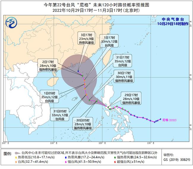 预计,“尼格”将以每小时25公里左右的速度向西偏北方向移动,将于30日凌晨进入南海中东部海面,31日以后转向北偏西方向移动,强度还将有所发展,最强可达台风级(33-35米/秒),之后向华南沿海靠近,强度逐渐减弱。