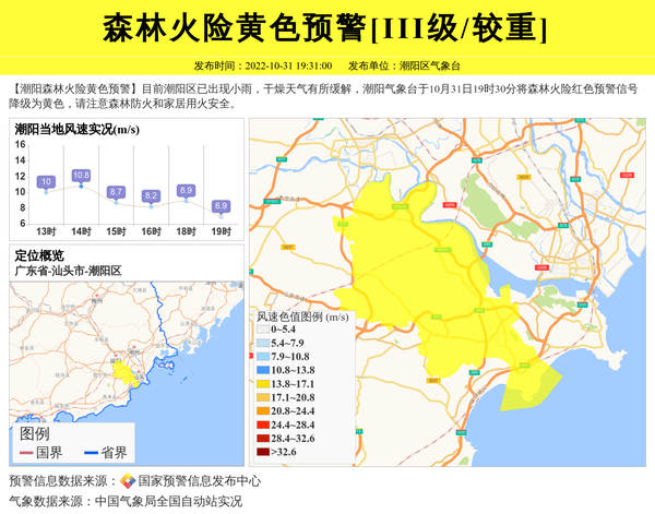 【潮阳森林火险黄色预警】目前潮阳区已出现小雨,干燥天气有所缓解,潮阳气象台于10月31日19时30分将森林火险红色预警信号降级为黄色,请注意森林防火和家居用火安全。 信息来源:国家预警信息发布中心; 发布单位:潮阳区气象台。