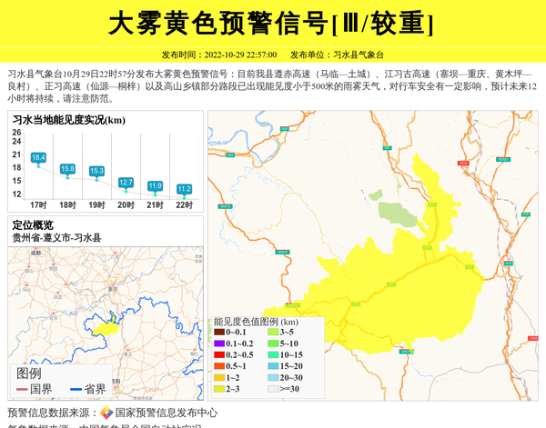 习水县气象台10月29日22时57分发布大雾黄色预警信号:目前我县遵赤高速(马临—土城)、江习古高速(寨坝—重庆、黄木坪—良村)、正习高速(仙源—桐梓)以及高山乡镇部分路段已出现能见度小于500米的雨雾天气,对行车安全有一定影响,预计未来12小时将持续,请注意防范。 信息来源:国家预警信息发布中心; 发布单位:习水县气象台。