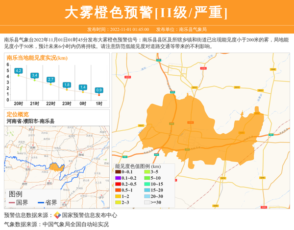 南乐县气象台2022年11月01日01时45分发布大雾橙色预警信号:南乐县县区及所辖乡镇和街道已出现能见度小于200米的雾,局地能见度小于50米,预计未来6小时内仍将持续。请注意防范低能见度对道路交通等带来的不利影响。 信息来源:国家预警信息发布中心; 发布单位:南乐县气象局。